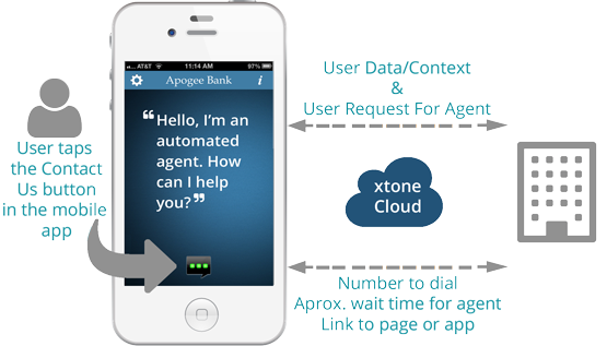 With the Xtone Virtual Agent, a user can quickly connect to a customer service agent or be provided with useful information without long hold times, complex IVR menus or multiple taps and swipes. When the user is connected to an agent, the agent is supplied with all pertinent mobile app and user data.